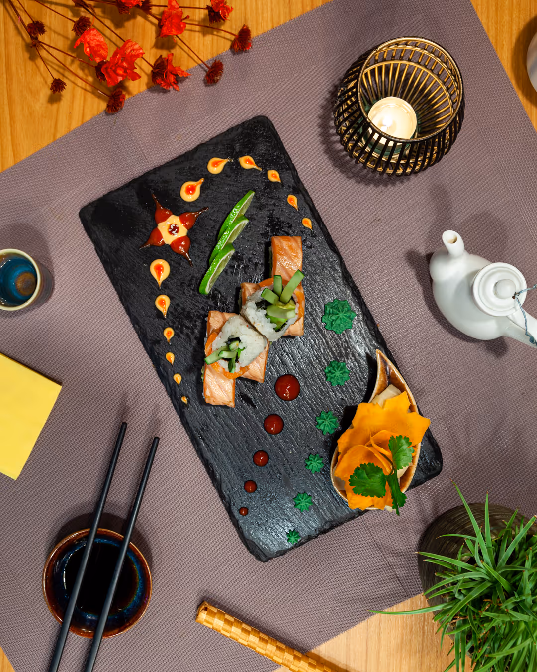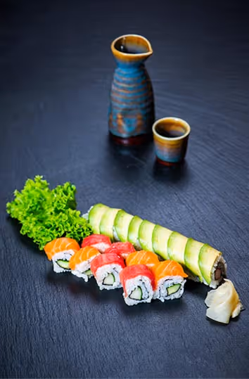 Je 4: Lachs, Thunfisch, Gurke, AvocadoJe 4: Alaska Tobiko, California Tobiko10 Nigiri (je 2 Stk.): Lachs, Thunfisch, Eierstich, Garnele, Krebsfleischimitat