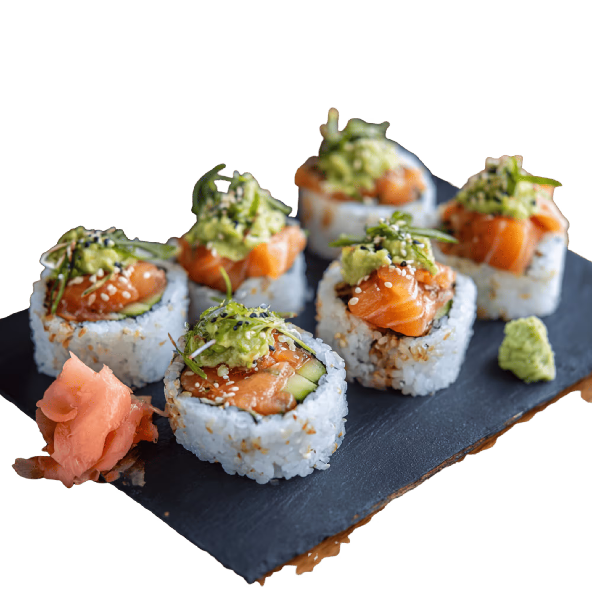 Gurke, Avocado und Lauch im flambierten Lachsmantel mit Tobiko & sweet-spicy-Mayo on top (8 Stück).